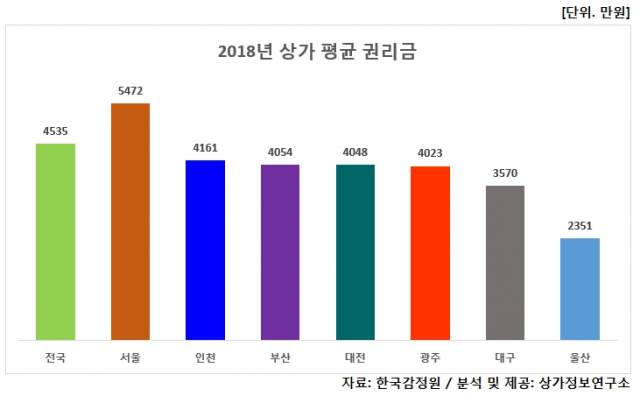 서울과 6개 광역시 가운데 권리금이 높은 지역은 서울로 5천472만원으로 파악됐고, 인천(4천161만원), 부산(4천54만원), 대전(4천48만원), 광주(4천23만원) 등의 순이었다.